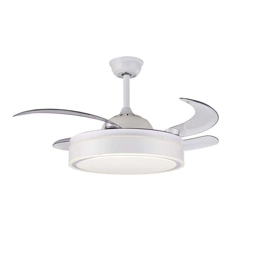 Ανεμιστήρας οροφής με φως, τηλεχειριστήριο και dc μοτέρ με ανοιγόμενα πτερύγια. Η βάση είναι από αλουμίνιο, σε γκρι χρώμα, και τα πτερύγια από ακρυλικό .Έχει έξι ταχύτητες , χρονοδιακόπτη και υπάρχει η δυνατότητα, μέσω του διακόπτη αλλά και του τηλεχειριστηρίου, αλλαγής θερμοκρασίας χρώματος 3000k/4000k/6000k.