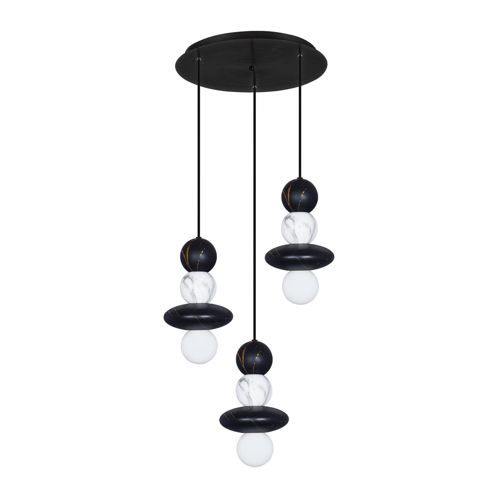 Κρεμαστό φωτιστικό τρίφωτο κατασκευασμένο από μέταλλο με εφέ μάρμαρου σε μαύρο και λευκό χρώμα.