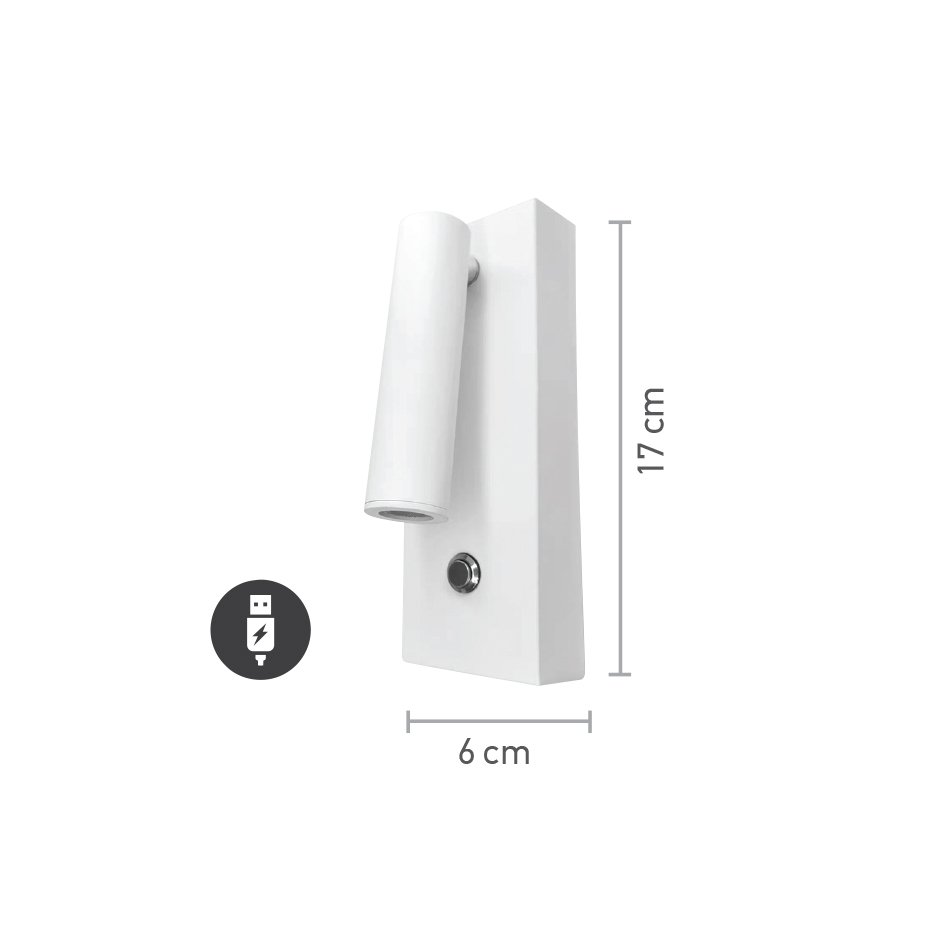 Επιτοίχιο φωτιστικό ανάγνωσης (spot) σε μαύρο ματ φινίρισμα, με διαστάσεις βάσης 6 × 17 cm. Είναι κατασκευασμένο από μέταλλο υψηλής αντοχής και διαθέτει ενσωματωμένο σποτ κυλινδρικού σχεδιασμού με δυνατότητα ρύθμισης της κλίσης για την ακριβή κατεύθυνση της φωτεινής δέσμης.Το φωτιστικό ενσωματώνει τεχνολογία LED ισχύος 3W, αποδίδοντας θερμό λευκό φως (3000K). Αυτό που ενισχύει την ιδιαιτερότητά του είναι οι ενσωματωμένες θύρες USB και Type-C στη βάση, οι οποίες δίνουν τη δυνατότητα ταυτόχρονης φόρτισης κινητών τηλεφώνων και άλλων συσκευών, καθιστώντας το μια ολοκληρωμένη τεχνική λύση για σύγχρονα ξενοδοχειακά καταλύματα και κεφαλάρια κρεβατιών.Ο εργονομικός σχεδιασμός του συμπληρώνεται από κεντρικό διακόπτη αφής (touch) για άμεσο έλεγχο, ενώ η μεταλλική του δομή εξασφαλίζει τη βέλτιστη απαγωγή θερμότητας και μακροχρόνια αξιοπιστία σε απαιτητικά επαγγελματικά περιβάλλοντα.ΧαρακτηριστικόΠεριγραφήΙσχύς ΦωτισμούLED 3WΘερμοκρασία Φωτός3000ΚΥλικό ΚατασκευήςΜέταλλοΧρώμαΜαύρο ΜατΔιαστάσεις6 × 17 cmΤοποθέτησηΕπιτοίχιαΣυνδεσιμότηταΘύρα USB & Θύρα Type-CΈλεγχοςΕνσωματωμένος Διακόπτης Αφής (Touch)Βαθμός ΠροστασίαςIP20