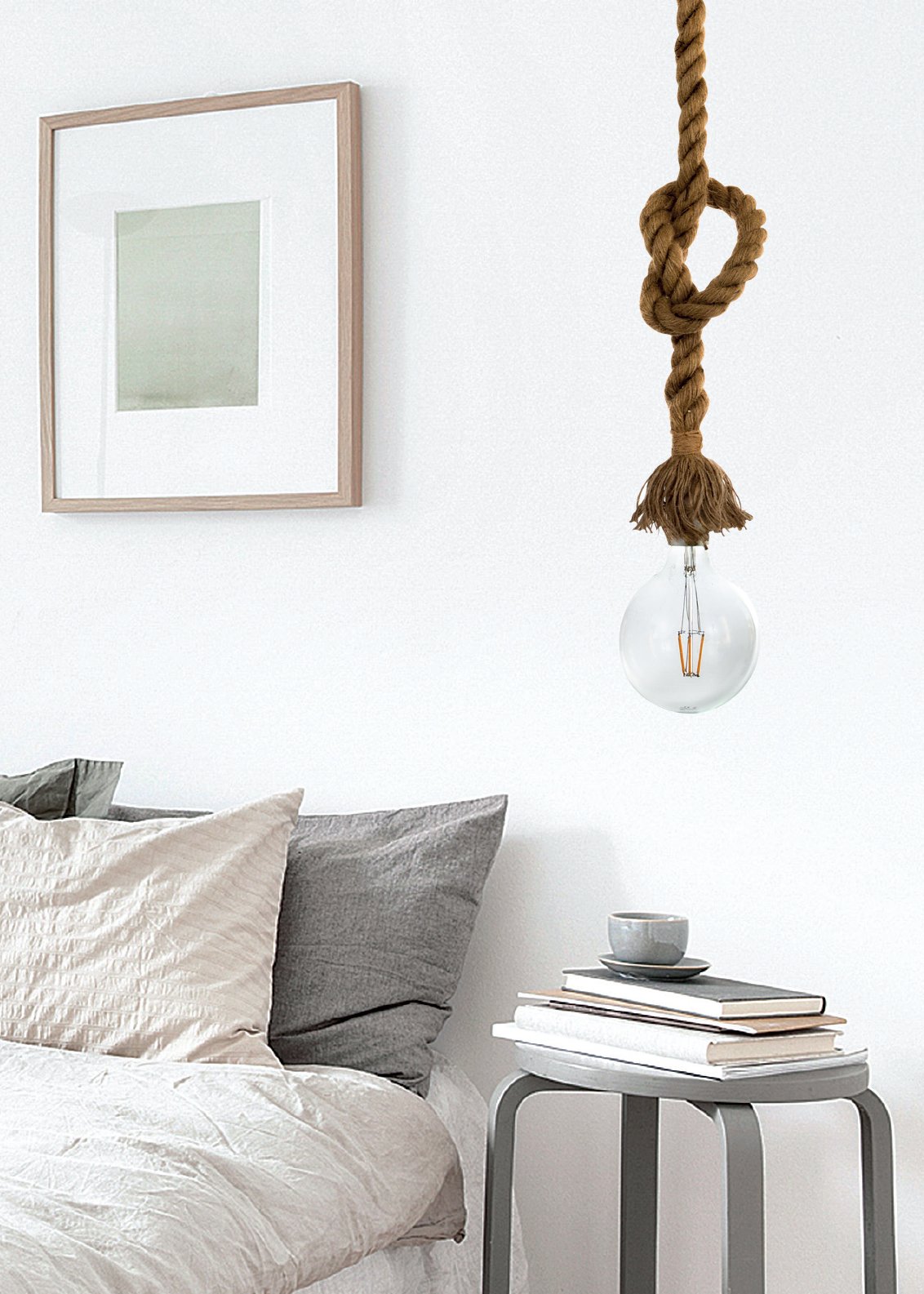 Μονόφωτο κρεμαστό φωτιστικό κατασκευασμένο από σχοινί και μεταλλική λευκή λεπτομέρεια στην οροφή. Το ύψος του μπορεί να ρυθμιστεί είτε κόβοντάς το σχοινί, είτε πλέκοντάς το δημιουργώντας επιπλέον κόμπο!