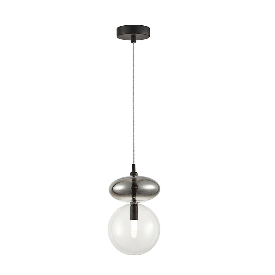 Μονόφωτο κρεμαστό φωτιστικό κατασκευασμένο από χειροποίητο γυαλί σε αποχρώσεις διάφανου και χρώμιου με μαύρα μεταλλικά στοιχεία.