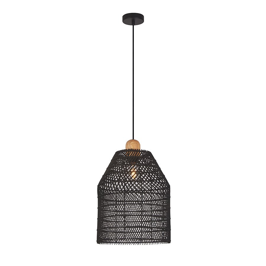 Κρεμαστό μονόφωτο φωτιστικό κατασκευασμένο από Rattan σε μαύρο χρώμα, με ξύλινα στοιχεία και μαύρη μεταλλική βάση.