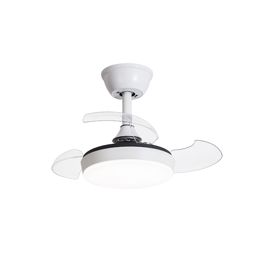 Ανεμιστήρας οροφής με φως και DC μοτέρ για αθόρυβη λειτουργεία. Διαθέτει τηλεχειριστήριο και πτυσσόμενα πτερύγια. Η βάση είναι από αλουμίνιο, σε λευκό χρώμα, ενώ τα πτερύγια είναι ακρυλικά σε διάφανο χρώμα.Διαθέτει έξι ταχύτητες, χρονοδιακόπτη και ταυτόχρονα παρέχει την δυνατότητα εναλλαγής θερμοκρασίας χρώματος σε όλο το φάσμα από 3000K-6000Κ αλλά και αυξομείωσης της φωτεινότητας.