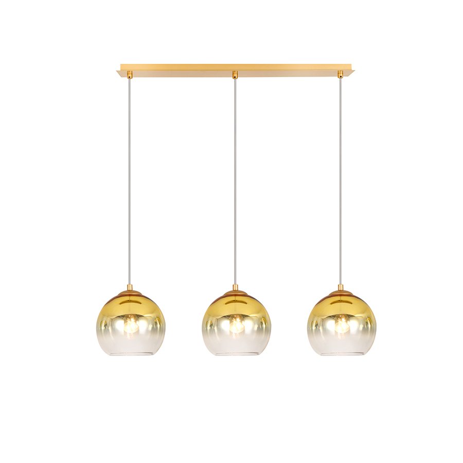 Τρίφωτο κρεμαστό φωτιστικό σε ράγα κατασκευασμένο από χειροποίητα γυαλιά σε χρυσό ντεγκραντέ και μεταλλική βάση σε χρυσό ματ.Ύψος: 120 εκ.Διάμετρος Γυαλιού : 18 εκ.Μήκος: 70 εκ.Λαμπτήρες: 3 τεμ.Τύπος Λαμπτήρα: Ε27Watt: 60