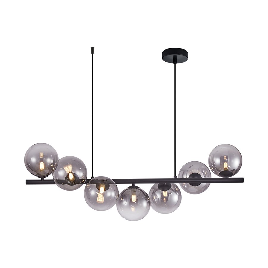 Πολύφωτο-κρεμαστό φωτιστικό, επτάφωτη ράγα, κατασκευασμένη από χειροποίητο γυαλί smoked και μεταλλικό σκελετό σε μαύρο χρώμα.