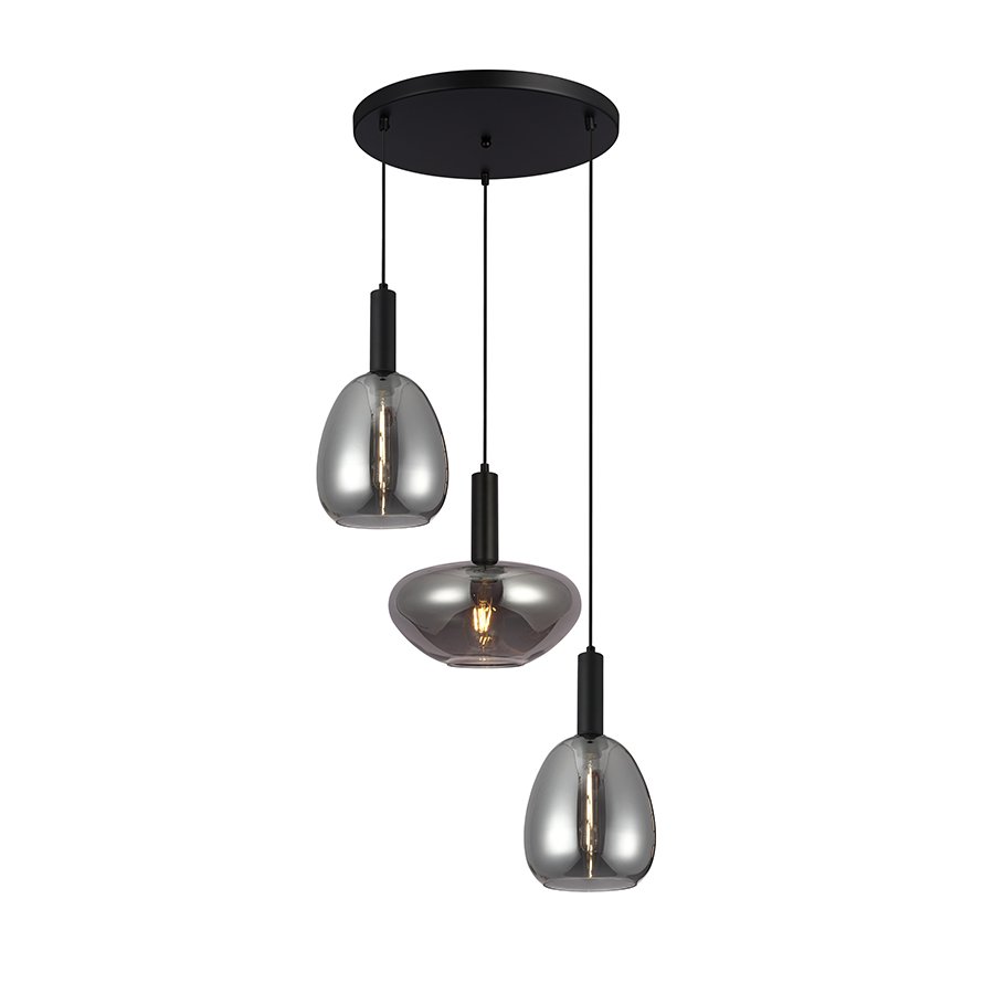 Τρίφωτο κρεμαστό φωτιστικό σε ροζέτα κατασκευασμένο από χειροποίητα γυαλιά σε χρώμα φιμέ και μέταλλο σε μαύρο ματ.