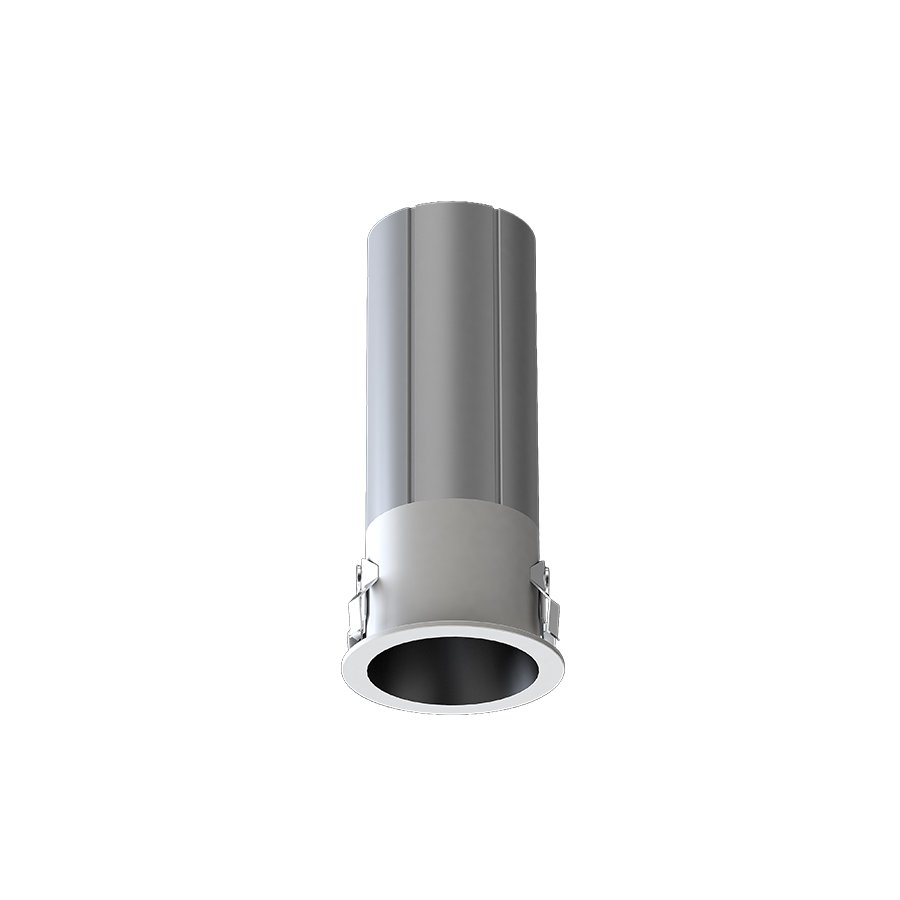 Φωτιστικό σποτ χωνευτό σε γκρι χρώμα με λευκό δαχτυλίδι και μαύρο ανακλαστήρα.