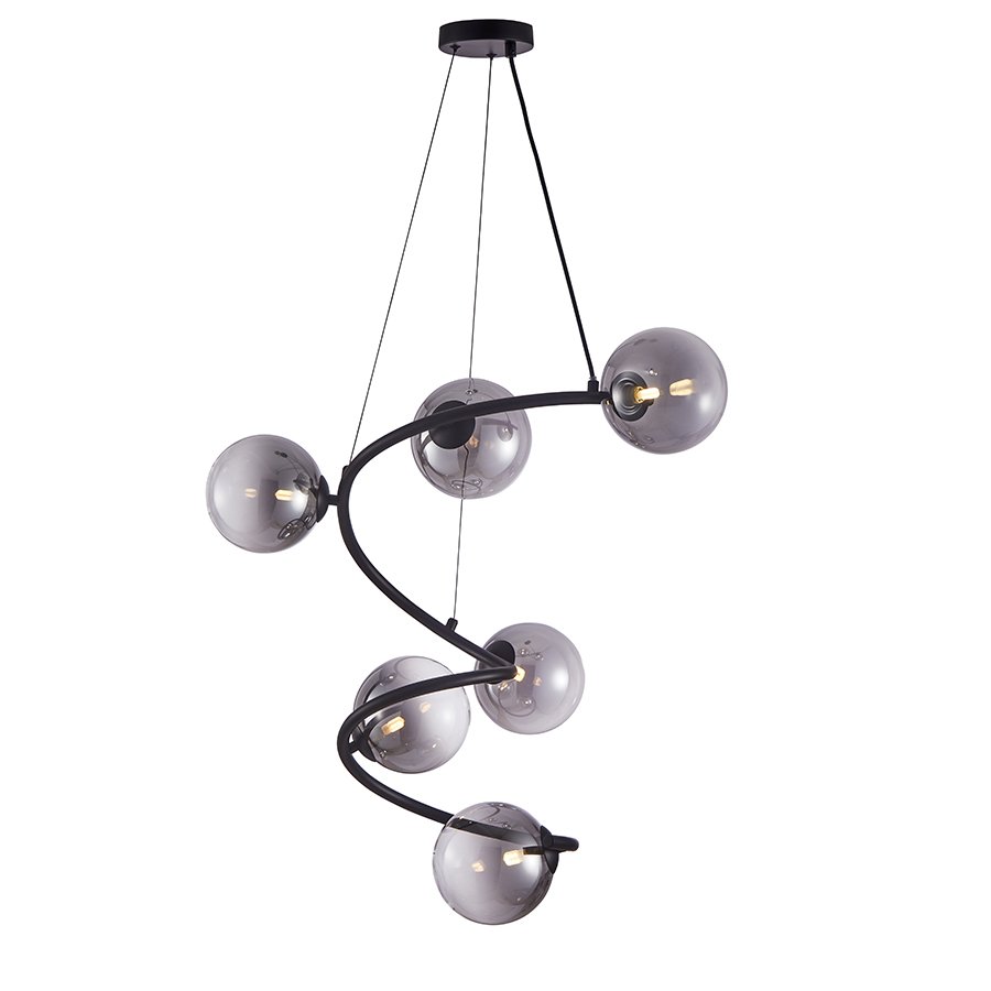 Εξάφωτο-κρεμαστό φωτιστικό κατασκευασμένο από χειροποίητο γυαλί smoked και μεταλλικό σκελετό σε μαύρο χρώμα.